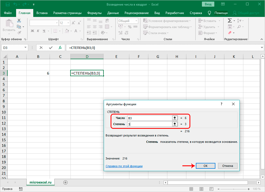 - “Степень” – аргумент, указывающий степень, в которую будет возводиться наше число. Так как мы рассматриваем возведение числа в квадрат, то указываем значение аргумента, равное цифре 2.