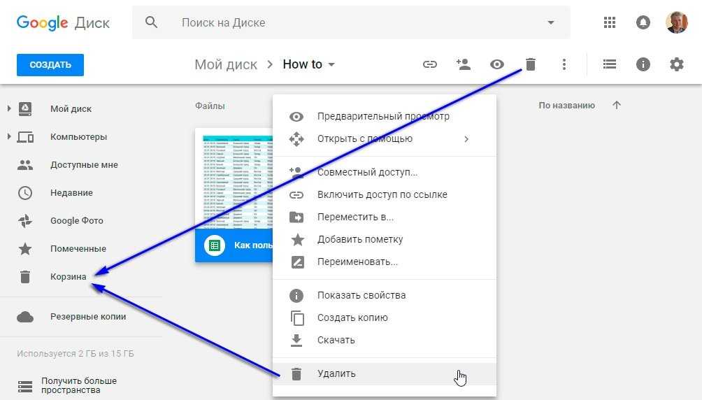 После этого нужно не забыть очистить корзину, чтобы удалить файл навсегда и освободить место на Google Диске.