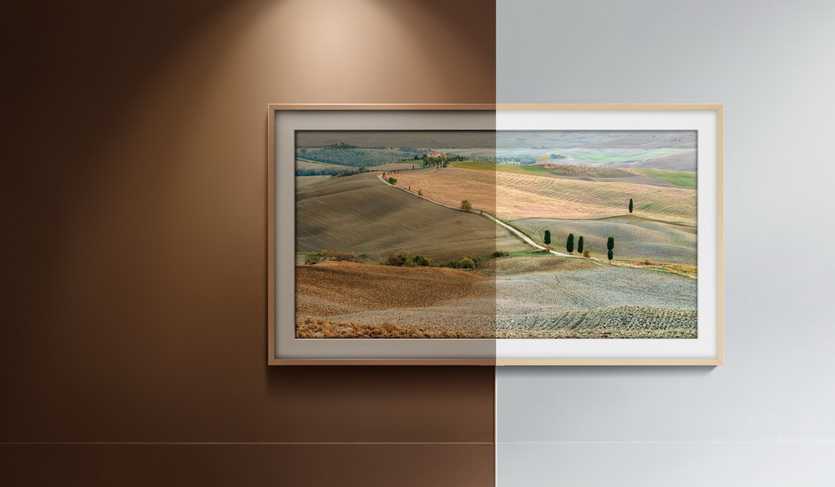 Как это работает? После настройки The Frame компенсирует более красноватые тона в начале дня и более прохладные тона в полдень. Вечером телевизор будет снижать яркость.