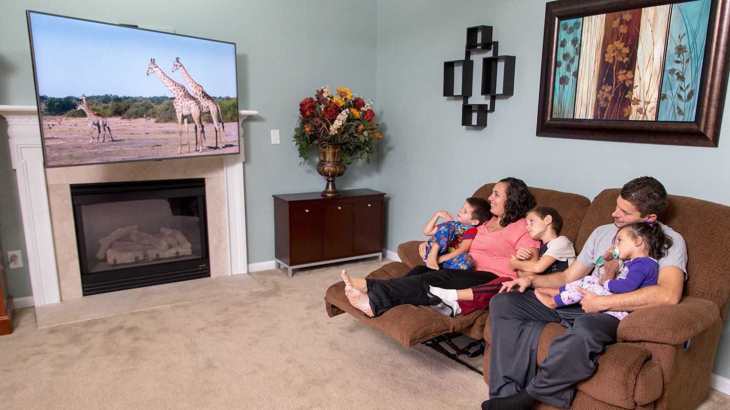 Но есть и хорошие новости для вас: существует несколько способов частично решить проблему. Во-первых, можно купить наклоняемый кронштейн с большим углом, чтобы получить более прямонаправленное по отношению к вам изображение. На рынке есть даже моторизированные кронштейны, которые опускают телевизор ниже к уровню глаз (но следите за тем, чтобы в этот момент в камине не горел огонь). Любой из вариантов улучшит насыщенность и контраст.