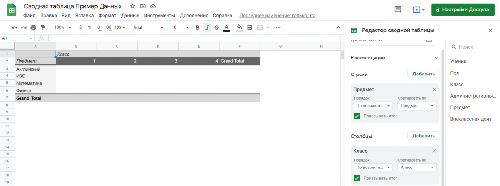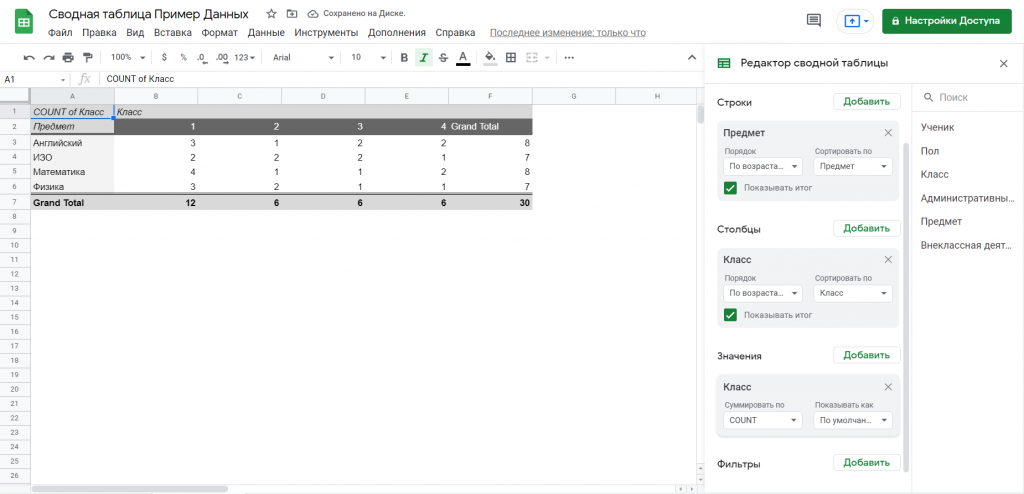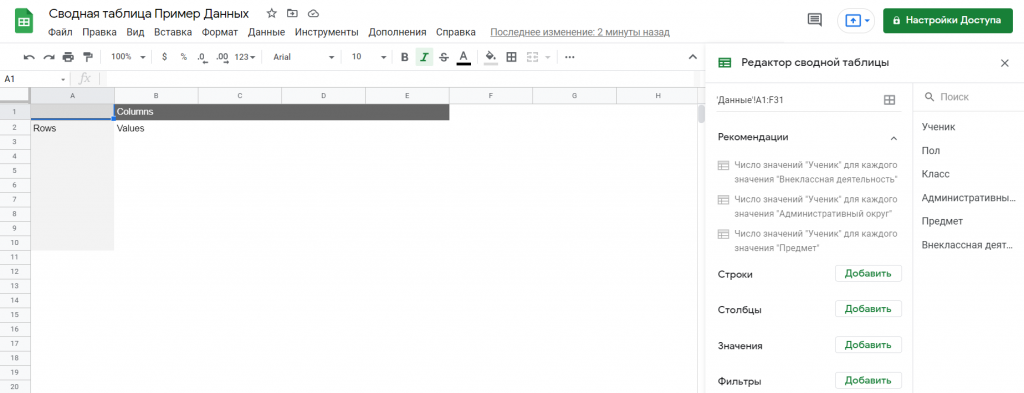 Перейдите в Данные -> Создать сводную таблицу. В появившемся окне выберите пункт вставить в новую таблицу. Откроется новый пустой лист с «Редактором сводной таблицы», где вы можете добавить две вышеуказанные метки столбцов для обобщения данных.