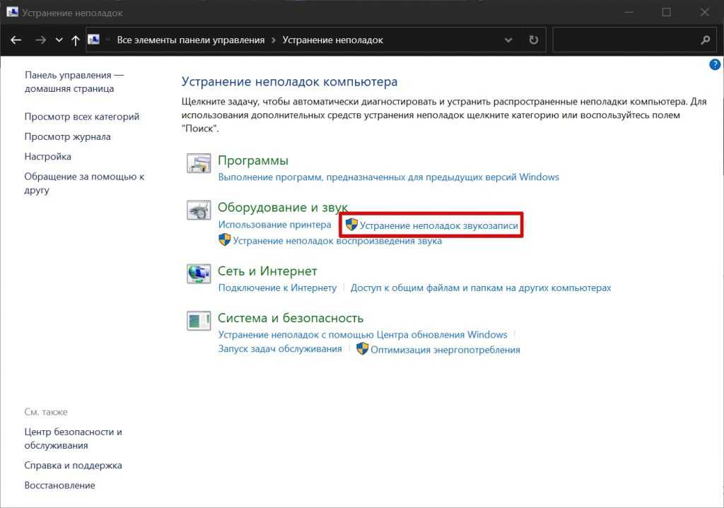 В разделе находят пункт «Запись звука», активируют процесс и следуют инструкциям мастера устранения неполадок. После завершения работы потребуется перезагрузка компьютера.