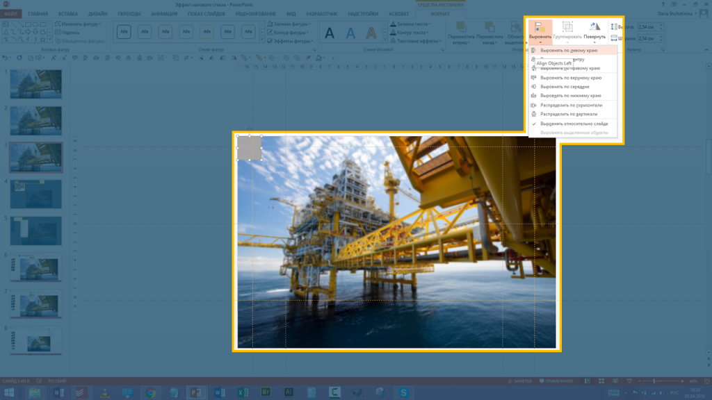 Отмасштабируем добавленный прямоугольник на весь слайд. Выровняем прямоугольник в верхний левый угол слайда используя команды «Выровнять по левому краю» и «Выровнять по верхнему краю» на вкладке «Формат» в области «Средства рисования» (область появится, когда мы щелкнем по прямоугольнику). Не забудьте поставить галочку «Выровнять относительно слайда»: