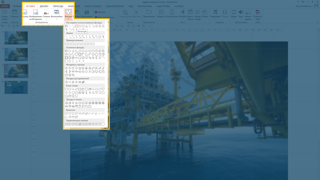 Не вставляя изображение, начните с выбора фигуры на вкладке Insert. Я возьму прямоугольник и перетащу его в слайд, чтобы поместить изображение внутри.