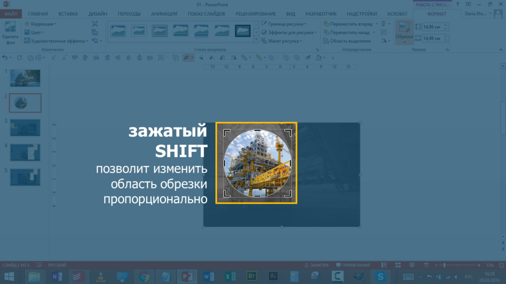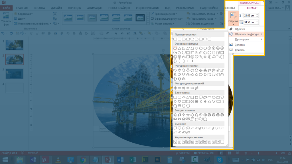Обрежем незаблюренную фотографию (ту, которую мы продублировали на первом шаге) по форме круга . Перейдите на продублированный слайд, щелкните мышкой по фото, в появившейся области «Работа с рисунком» на вкладке «Формат» и выберите «Обрезка» — «Обрезать по фигуре» — «Овал» (расположен в блоке «Основные фигуры»).