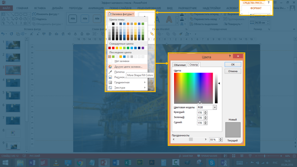 Чтобы залить фигуру «точным» цветом RGB (а не на глаз), выберите в меню «Заливка фигуры» пункт «Другие цвета заливки». Откроется диалоговое окно «Цвета», где на вкладке «Спектр» можно выбрать цветовую модель RGB и задать цвет цифрами (я использую RGB 170 170 170). Тут же зададим прозрачность 55%: