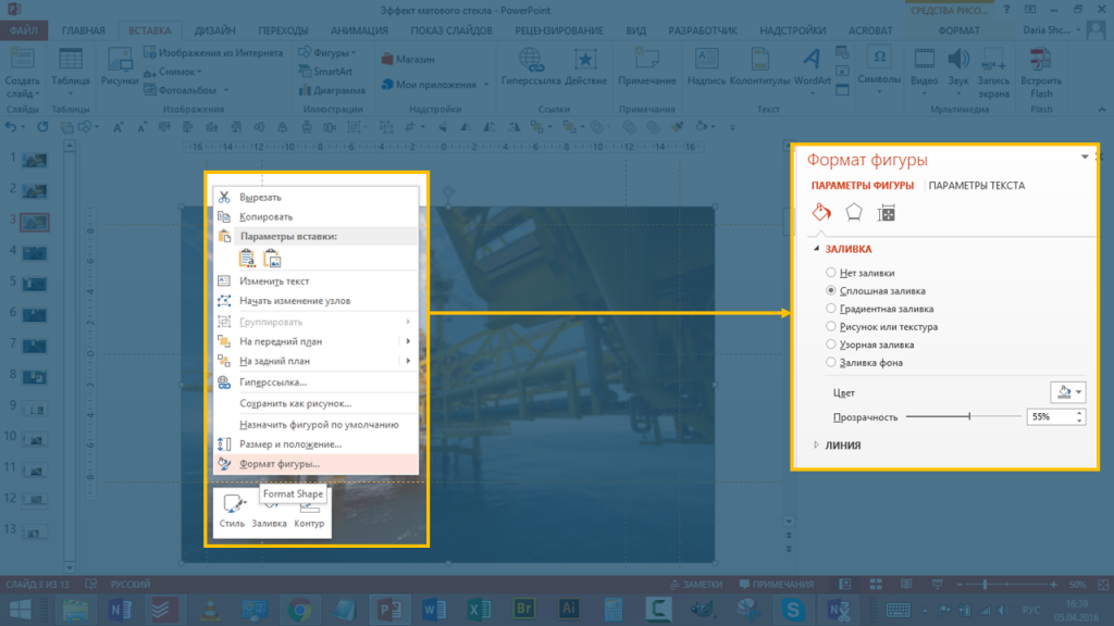 Другой способ задать прозрачность цвета — щекнуть правой кнопкой мыши по прямоугольнику, и выбрать в контекстном меню «Формат фигуры». В правой части окна PowerPoint откроется меню «Формат фигуры», где на вкладке «Параметры фигуры» также можно задать прозрачность: