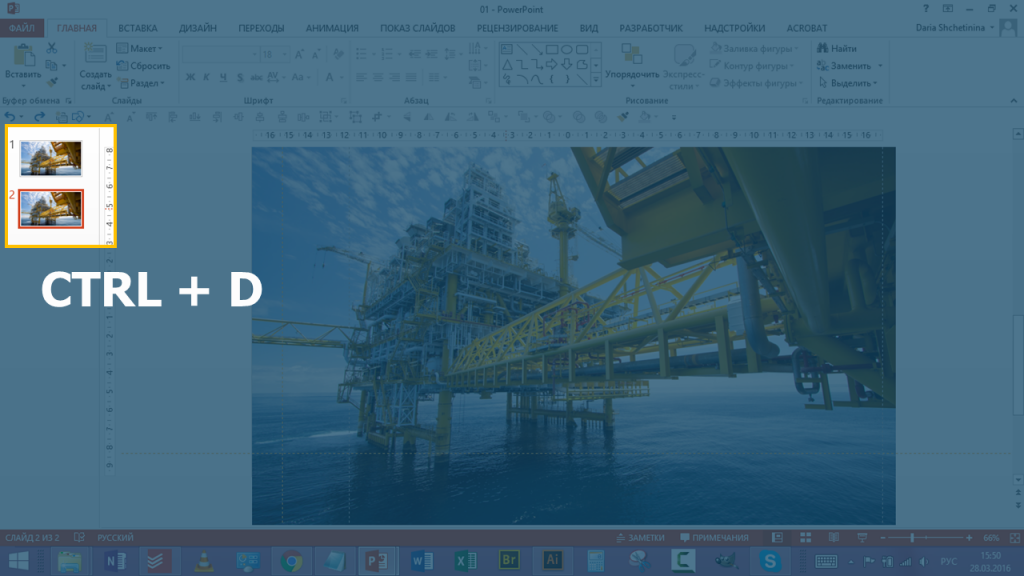 Понадобятся две копии картинки, поэтому создаем дубль слайда: щелкните по слайду в области эскизов (это левая часть окна PowerPoint) и наберите с клавиатуры CTRL+D.