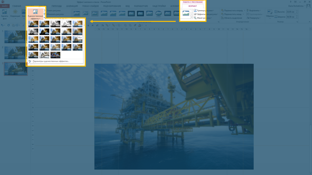 Применим к одной из фотографий эффект «Blur». Щелкните мышкой по фотографии, в появившейся области «Работа с рисунком» на вкладке «Формат» выберите «Художественные эффекты» — «Blur».