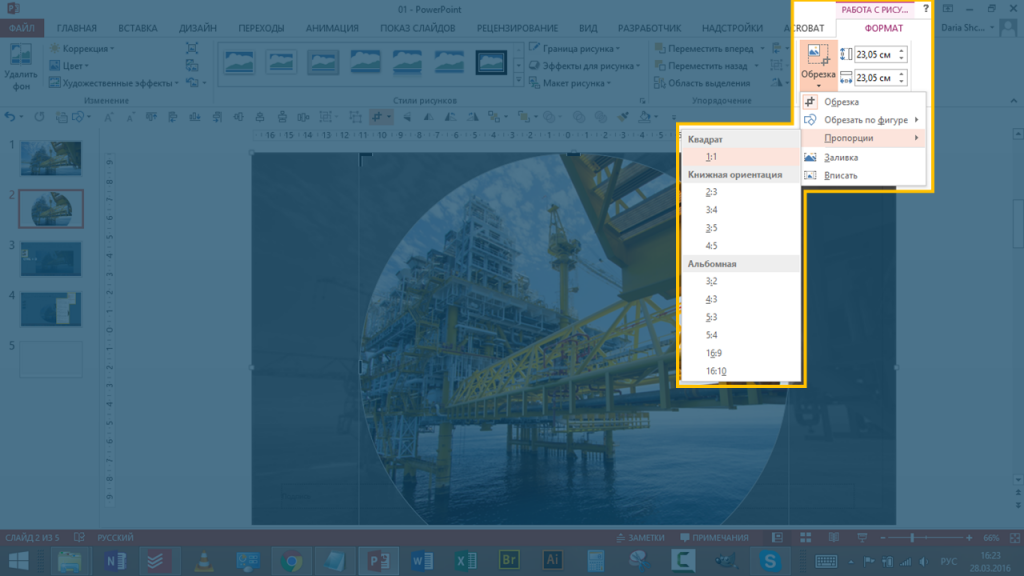 Чтобы овал стал кругом, задаем пропорции: щелкнем по фото, выберем «Работа с рисунком» — «Формат» — «Обрезка» — «Пропорции» — «Квадрат 1:1».