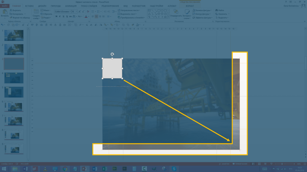 Скопируем (CTRL+C и CTRL+V снова работают) обрезанную фотографию на другой слайд, где уже оформлен эффект «матового стекла». Получится вот такой «чистый фокус»: