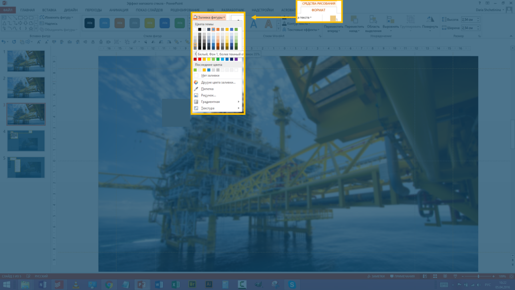 Уберем границы у прямоугольника и зальем его светло-серым цветом с прозрачностью 55%. Это можно сделать на вкладке «Формат» в области «Средства рисования» (не забываем выделить прямоугольник сначала).