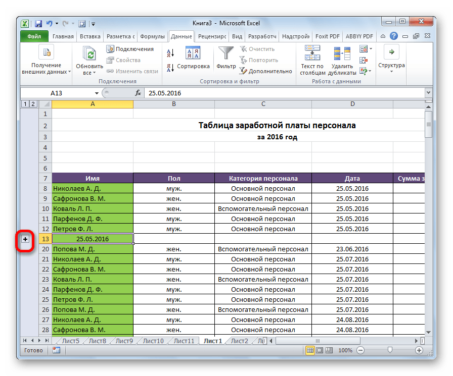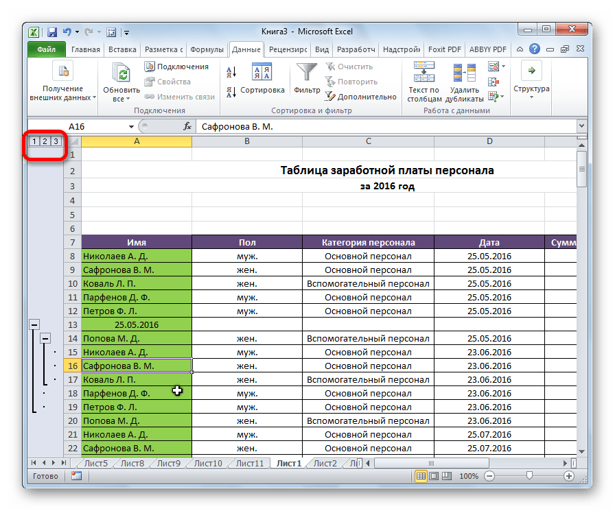 Опосля этого вложенная группа будет готова. Можно создавать огромное количество схожих вложений. Навигацию меж ними просто проводить, перемещаясь по цифрам, размещенным слева либо сверху листа в зависимости от того, что сгруппировано строчки либо столбцы.