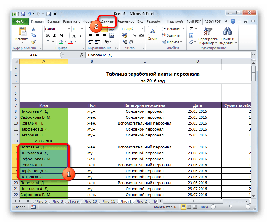 Выделяем строки, которые нужно сгруппировать, кроме итоговой строки. Переходим во вкладку «Данные».