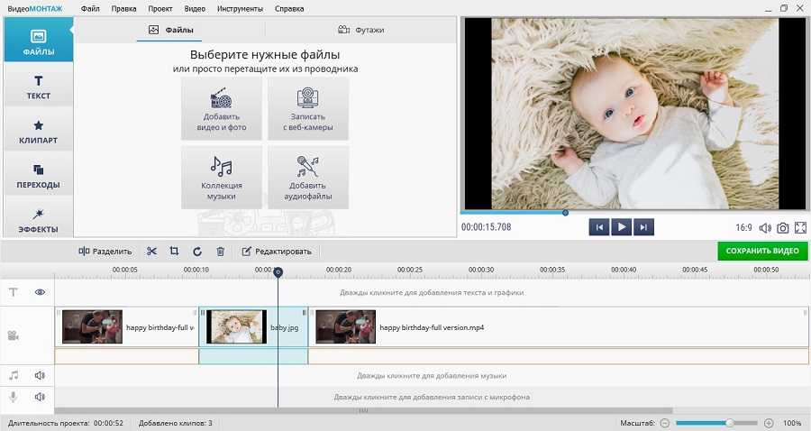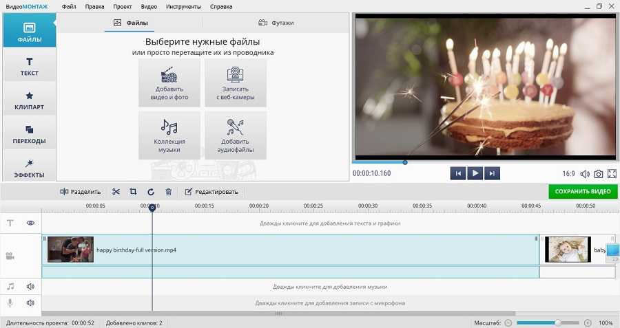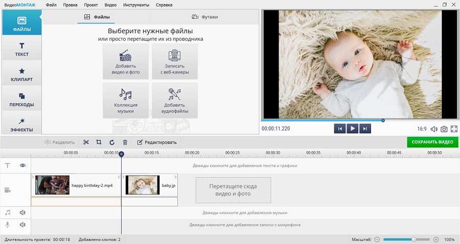 Запустите «ВидеоМОНТАЖ» и кликните «Новый проект», если вы начинаете обработку с нуля. Нажмите «Добавить видео и фото». Подгрузите в редактор нужные картинки и видеофайлы.