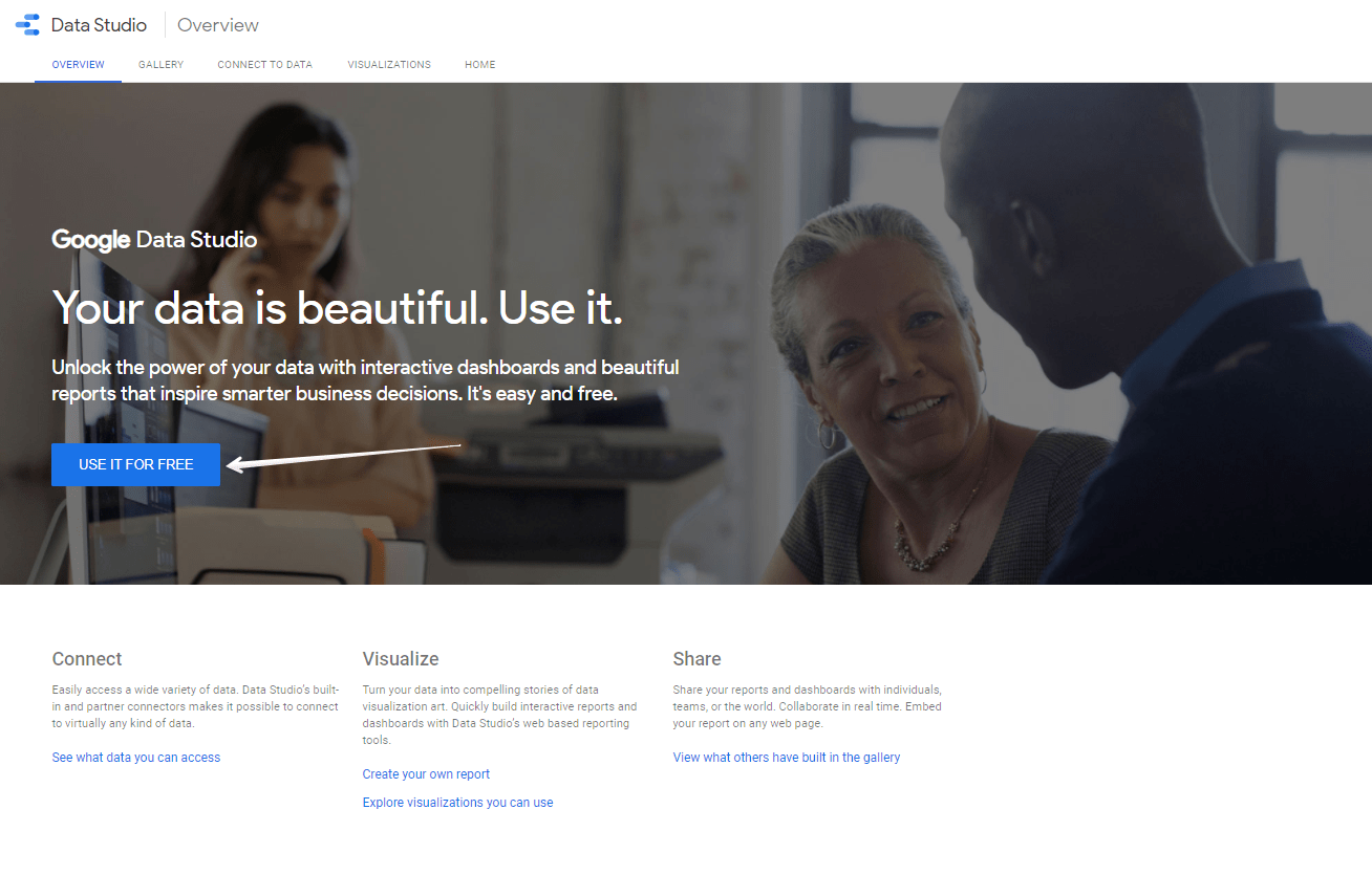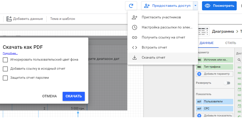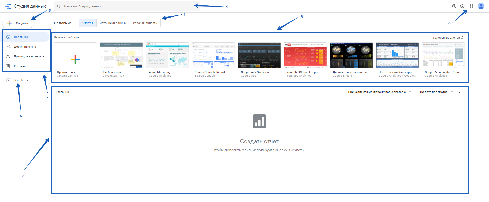 По интерфейсу Google Data Studio очень похож на Google Диск, поэтому тут должно быть все интуитивно понятно