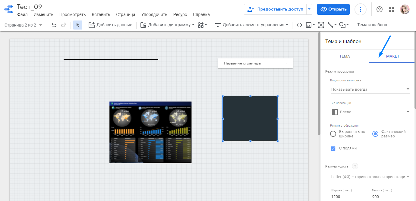 На вкладке «Макет» мы можем изменить видимость заголовка, тип навигации, размер холста, режим отображения, поля, настроить сетку и умные направляющие.