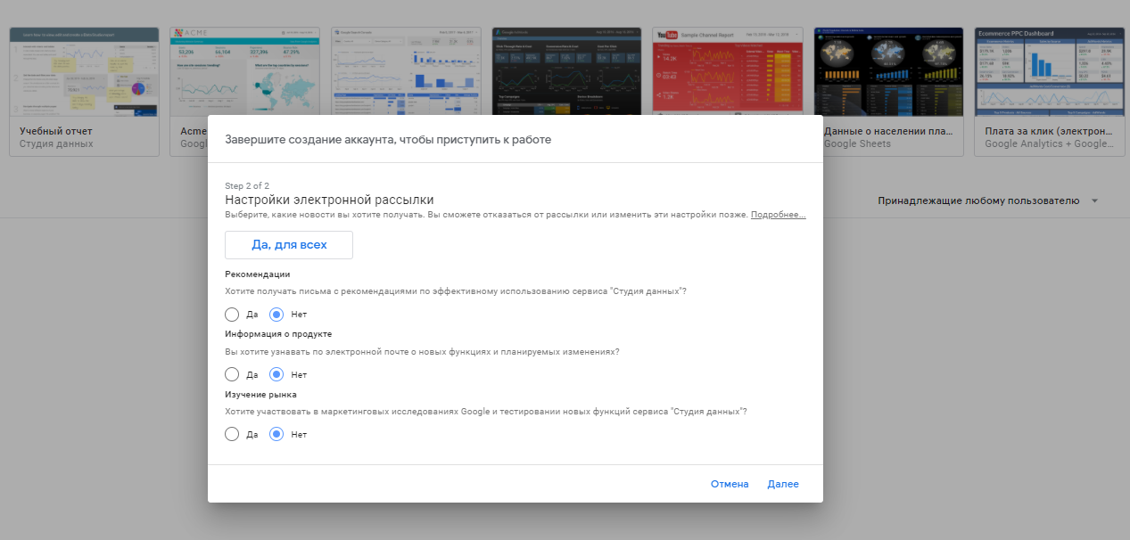 Отметьте, какие рассылки вы хотите получать от Google Data Studio.