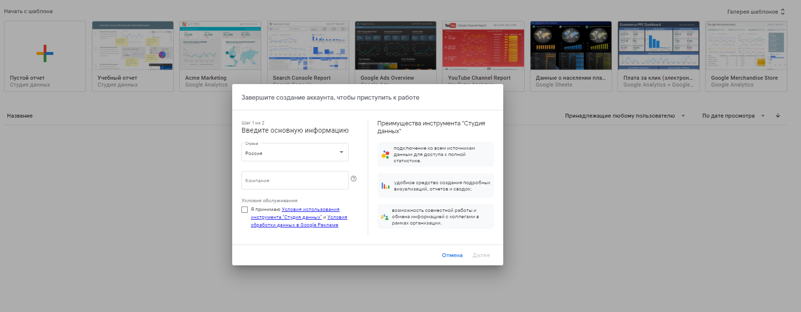 Если вы вошли в «Студию данных» первый раз под этим аккаунтом, сначала придется его настроить и задать условия подписки на рассылки.