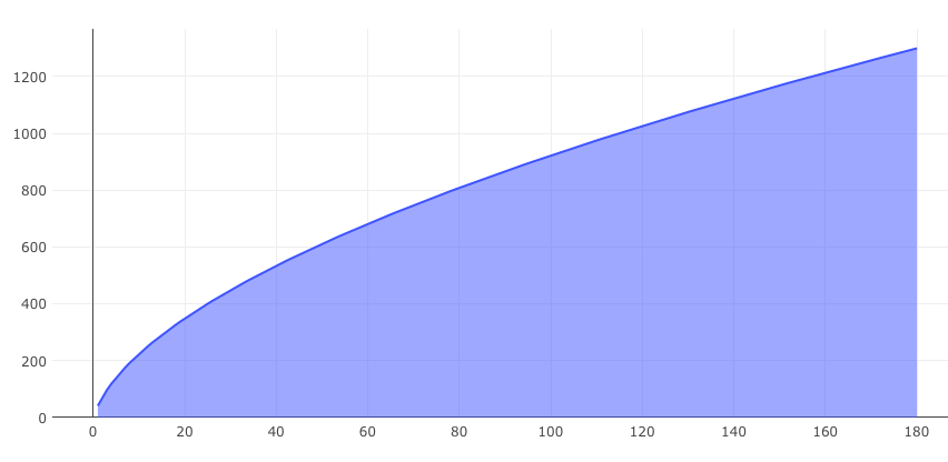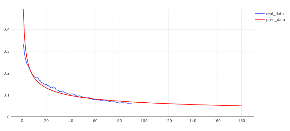 И получим прогноз на 180 дней, подставив параметры в степенную функцию, описанную ранее. Заодно посчитаем Lifetime — кумулятивную сумму спрогнозированных данных. В подзапросе coef мы получим только два числа — параметр наклона и перехвата. Чтобы эти параметры были доступны каждой строке подзапроса lt, делаем cross join к coef: