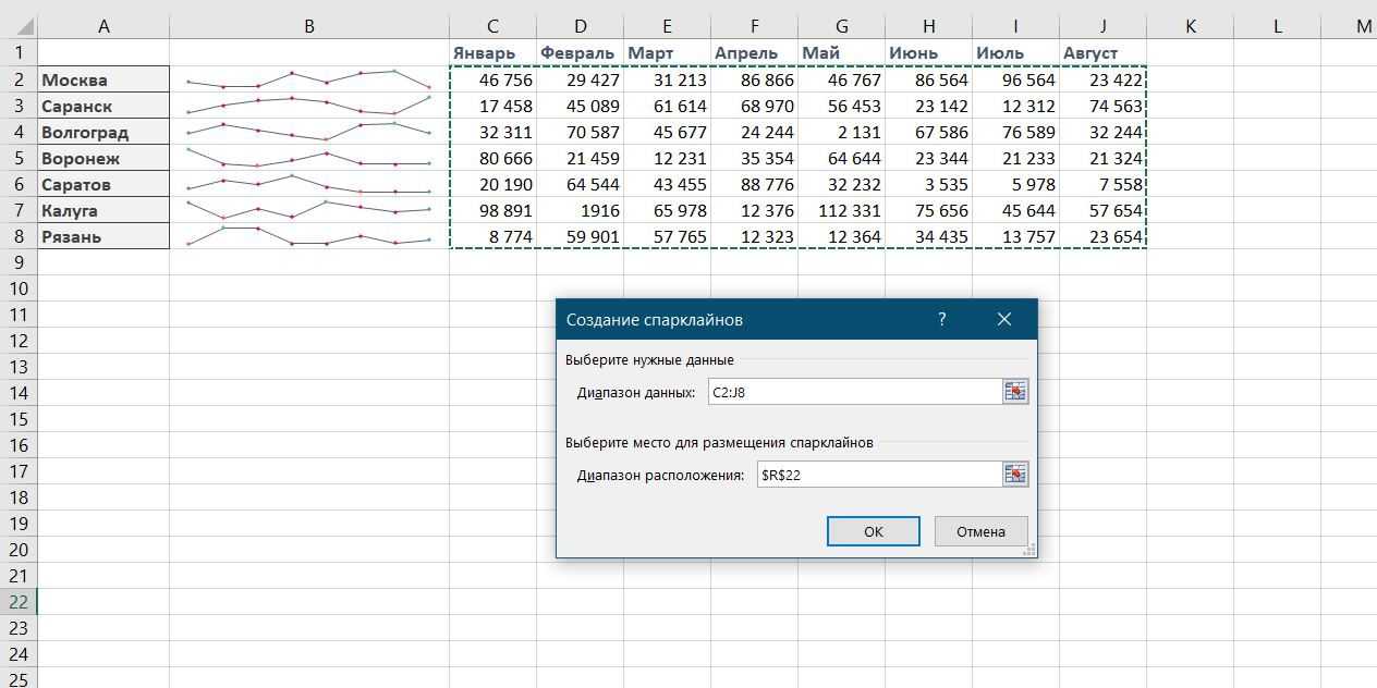 Спарклайны — это нарисованные прямо в ячейках миниатюрные диаграммы, наглядно отображающие динамику наших данных. Чтобы их создать, нажмите кнопку «График» (Line) или «Гистограмма» (Columns) в группе «Спарклайны» (Sparklines) на вкладке «Вставка» (Insert). В открывшемся окне укажите диапазон с исходными числовыми данными и ячейки, куда вы хотите вывести спарклайны.