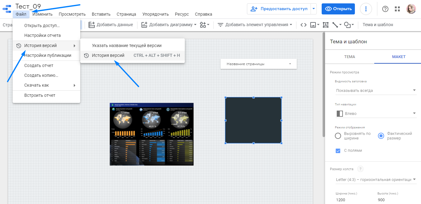 В Google Data Studio, так же как и в Google Документах и Таблицах, сохранять ничего не надо. Все изменения сохраняются автоматически, в том числе – история версий, чтобы в случае ошибок можно было откатить все назад.