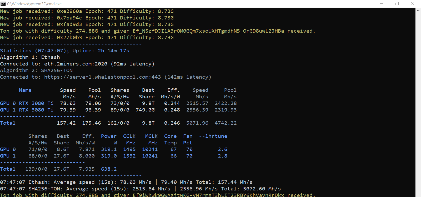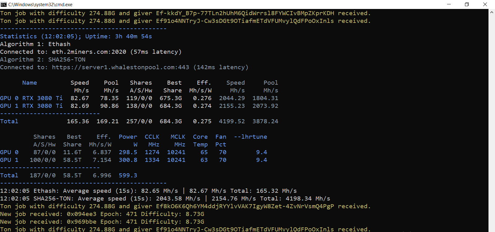 Хешрейт на алгоритме Ethash в этом варианте дуал-майнинга составляет 78-79 Mh/s, что на 6 Mh/s ниже, чем при майнинге только на алгоритме Ethash. Хешрейт на алгоритме SHA256 составляет 2515-2556 Mh/s. Хэшрейт на алгоритме SHA256 зависит от частоты ядра и PL. При высокой величине CC акцент смещается в сторону добычи TON.