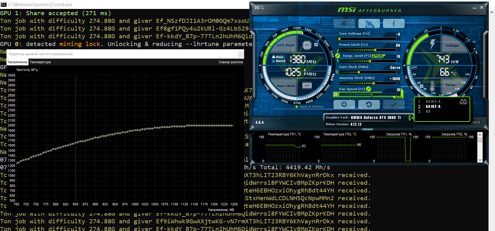 Вариант 2. Зафиксируем частоту и напряжение. Фиксация проводилась с помощью Voltage/Frequency Curve Editor в MSI Afterburner. Запустим майнер на нашем РИГе при следующих настройках видеокарт: PL(%): 80, CC (MHz): 0 fix Voltage(mV) 725, MC (MHz): +1000.