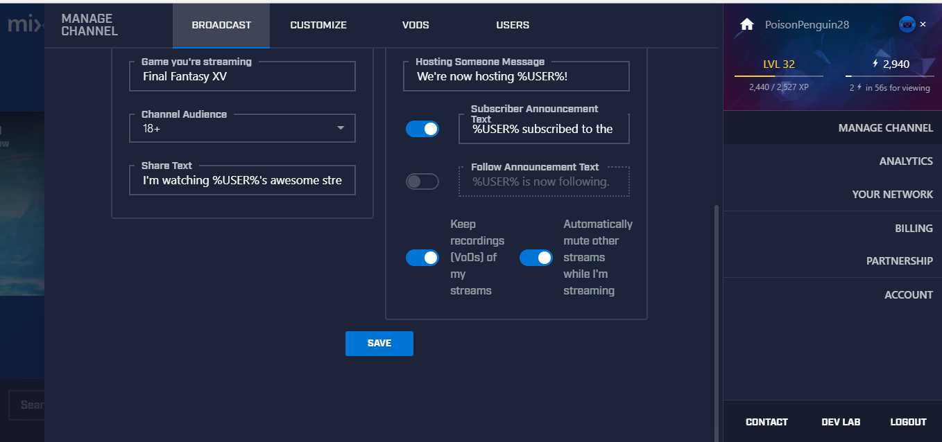После входа в систему выберите вкладку «Потоковая передача» и настройте параметры потоковой передачи. Возможно, вы захотите изменить название своей трансляции, язык, который вы используете, уровни звука и разрешение потоковой передачи.