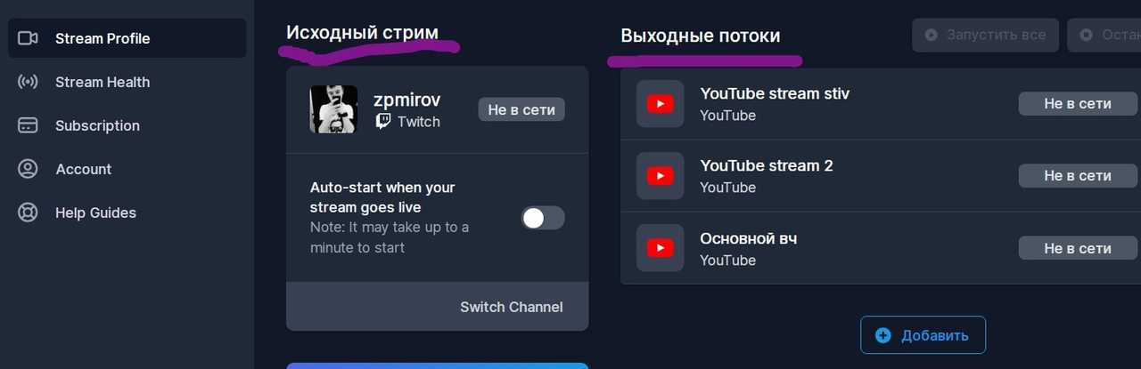 Выходные потоки: Это именно то место куда будет идти ретрансляция с исходного стрима — > жмем добавить — > добавляем именно тот канал, на который желаете ретранслировать.