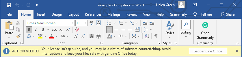 Недавно, когда я открываю свои файлы Word или Excel, появляется желтый баннер, предупреждающий меня о подлинной проблеме с Office. Он находится над содержимым и прямо под панелью инструментов. Полное сообщение приведено ниже.