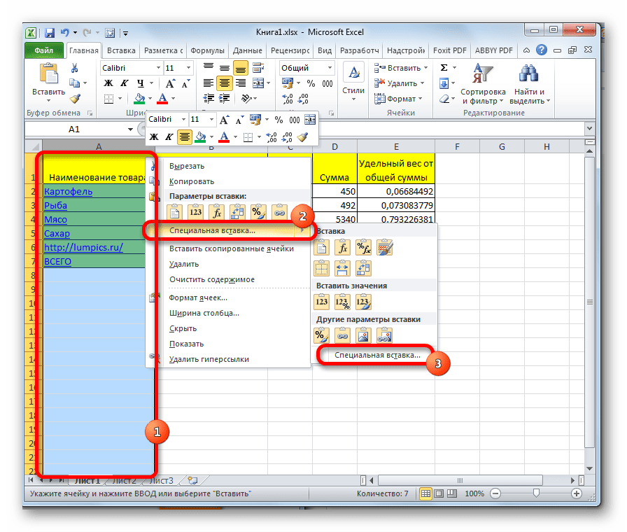 Выделяем ячейки, в которых расположены гиперссылки. Если вы хотите выбрать весь столбец, то кликните по его наименованию на горизонтальной панели. Если нужно выделить весь лист, наберите сочетание клавиш Ctrl+A. Кликните по выделенному элементу правой кнопкой мыши. В контекстном меню дважды перейдите по пункту «Специальная вставка…».