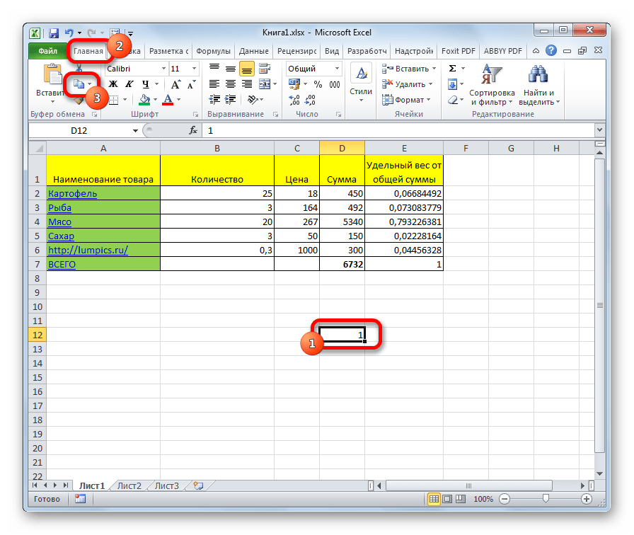 - Выделяем любую пустую ячейку на листе. Ставим в ней цифру 1. Жмем на кнопку «Копировать» во вкладке «Главная» или просто набираем на клавиатуре сочетание клавиш Ctrl+C.