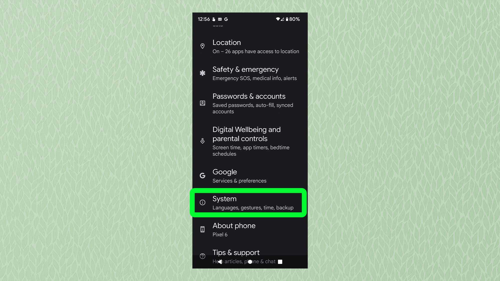 - Войдите в параметры, прокрутите в самый низ и откройте в разделе «Система и устройство» пункт Гугл.