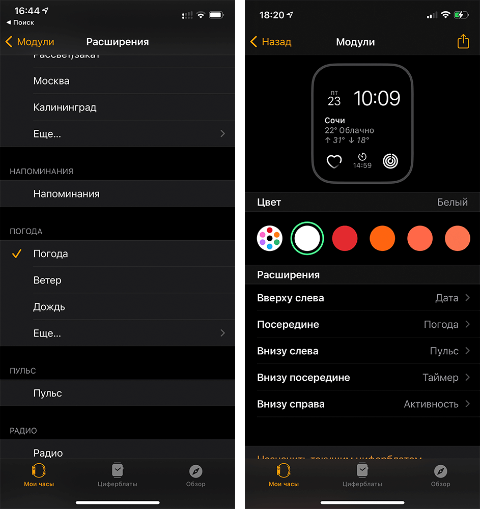 Для этого в списке циферблатов выберите вариант с возможностью настройки дополнений (рядом должна быть шестерёнка). Примените этот циферблат и на главном экране выполните долгое нажатие, чтобы появилась кнопка настроек.