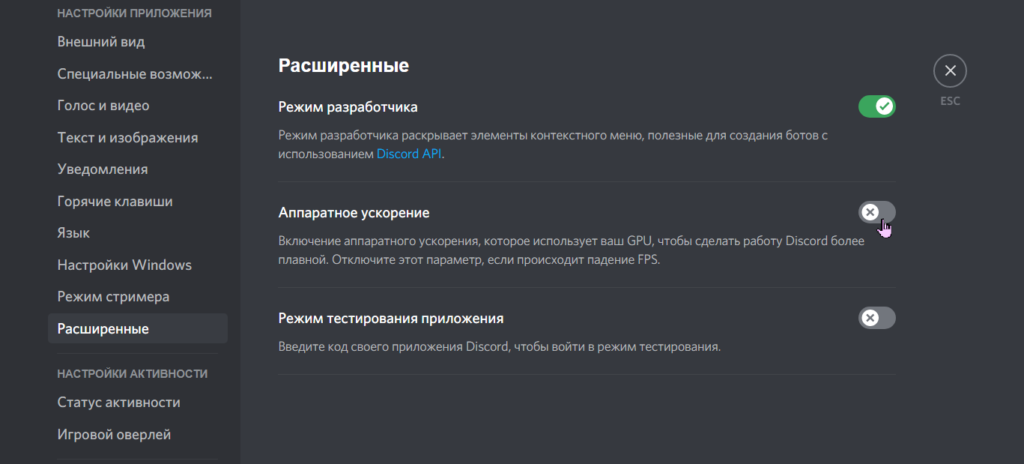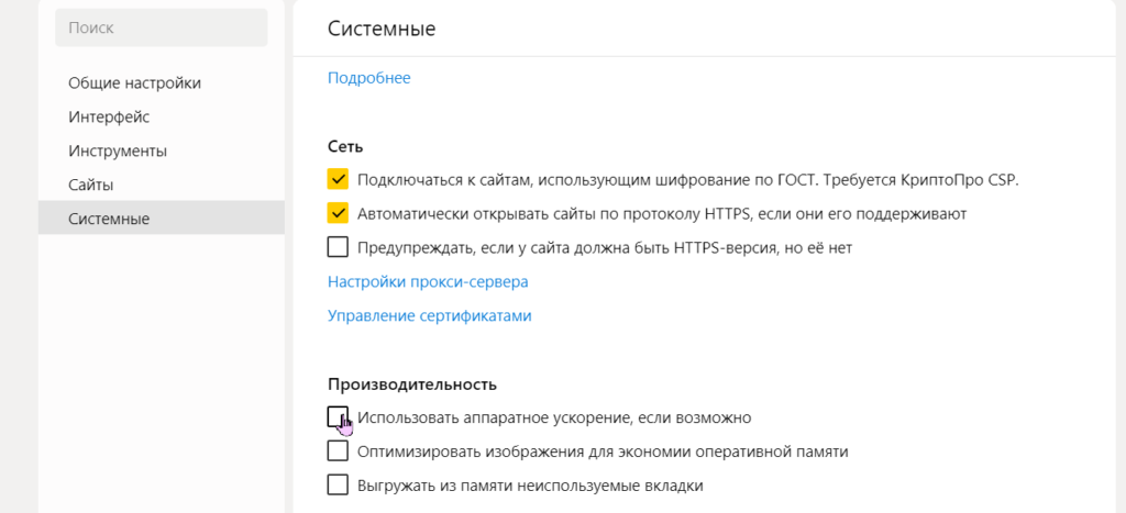 2) На левой панели перейдите в раздел «Расширенные» и отключите опцию «Аппаратное ускорение».