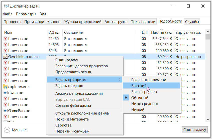 После того, как мы нашли нужную программу, нужно кликнуть по ней правой кнопкой мыши, затем навести на вкладку “Приоритет” и выставить параметр “Высокий“. Подробнее смотрите на скриншотах.