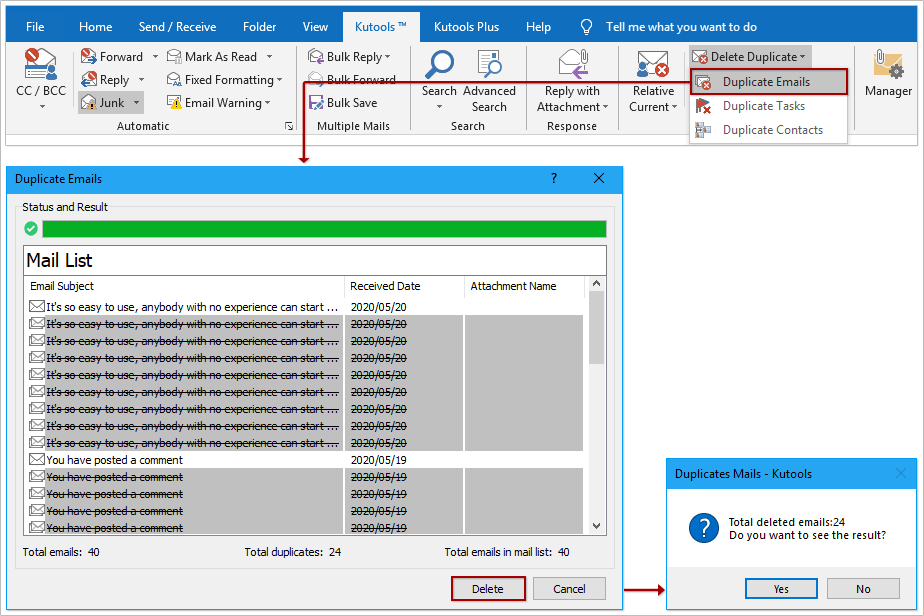 С Kutools для Outlook Повторяющиеся электронные письма функцию, вы можете быстро найти и удалить их из нескольких почтовых папок или найти и удалить все дубликаты из выбранных двумя щелчками мыши в Outlook.