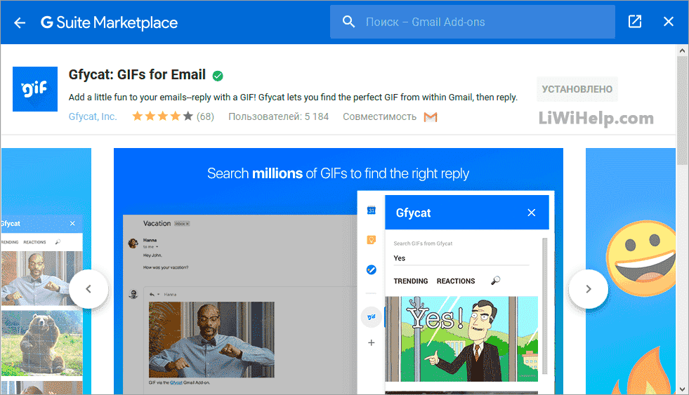 В будущем вы увидите значок “Gfycat” на боковой панели всякий раз, когда захотите ответить на полученное по электронной почте. Нажмите на него, выберите понравившийся GIF-файл из огромного каталога сервиса создания, открытия и совместного использования GIF и коротких видеороликов и вставьте его в свой ответ.