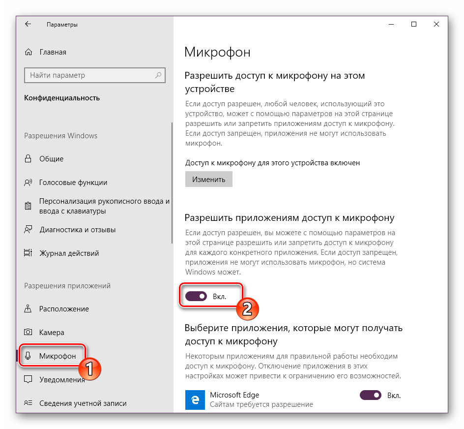 - Ошибка «Микрофон в настоящее время недоступен». Windows 10 нередко меняет параметры конфиденциальности, что и приводит к подобной проблеме. В параметрах нужно нажать на пункт с соответствующим названием и в окне слева найти раздел «Разрешения приложений». В списке должен быть микрофон. В окне справа следует выбрать «Вкл.» и отдельно выставить разрешение для «Win32WebViewHost» (может находится в перечне приложений). После проведения всех действий рекомендуется перезагрузить ПК.