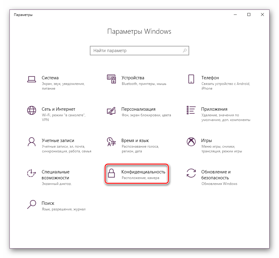 В открывшемся окне выберите раздел «Конфиденциальность».