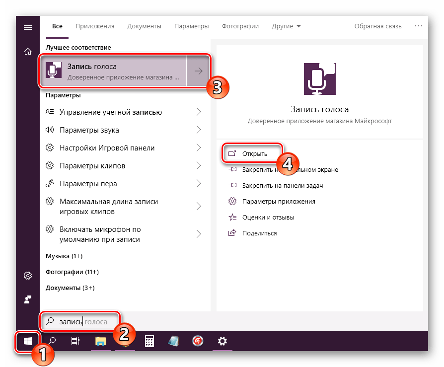 Далее откройте «Пуск» и через поиск найдите «Запись голоса».