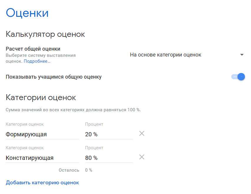 Имеет смысл создать две категории отметок — формирующие и констатирующие, так как в этом случае мы можем включить в Google Классе расчет общей оценки, учитывающей эти категории. Это делается в окне настроек учебного курса: