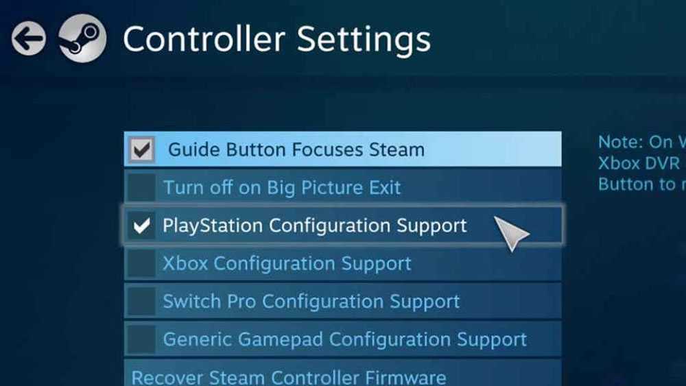 Затем подключить PS4 DualShock 4 к ПК. Как и в случае с Xbox One, можно использовать USB-кабель: он будет работать со Steam без какого-либо дополнительного программного обеспечения, если щелкнуть правой кнопкой мыши по значку «Steam» на панели задач и выбрать «Big Picture». Зайти в «Настройки», затем – «Настройки контроллера» и убедиться, что включена поддержка конфигурации PS4.