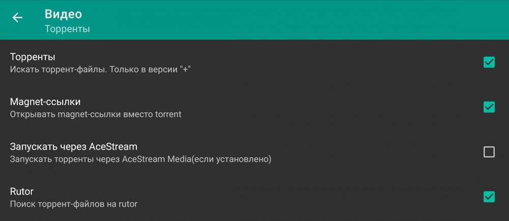 Теперь нужно проверить настройки программы. В разделе «Видео» – «Торренты» отметить галочками пункты «Торренты», «Magnet-ссылки», «Rutor». А в пункте «Запускать через AceStream» убрать галочку.