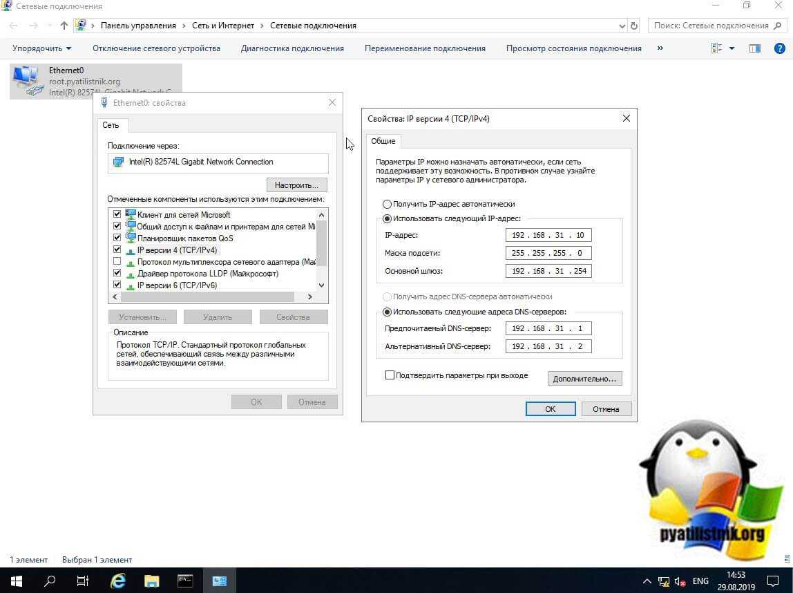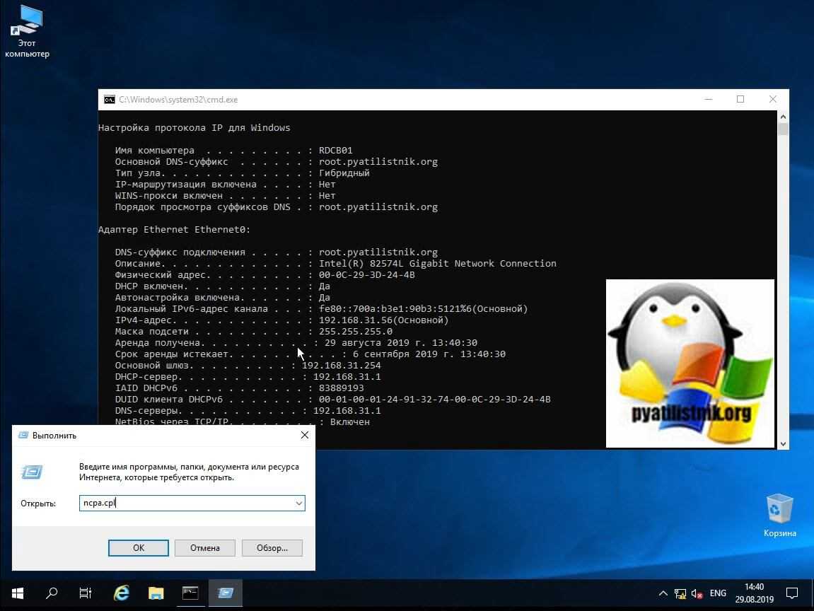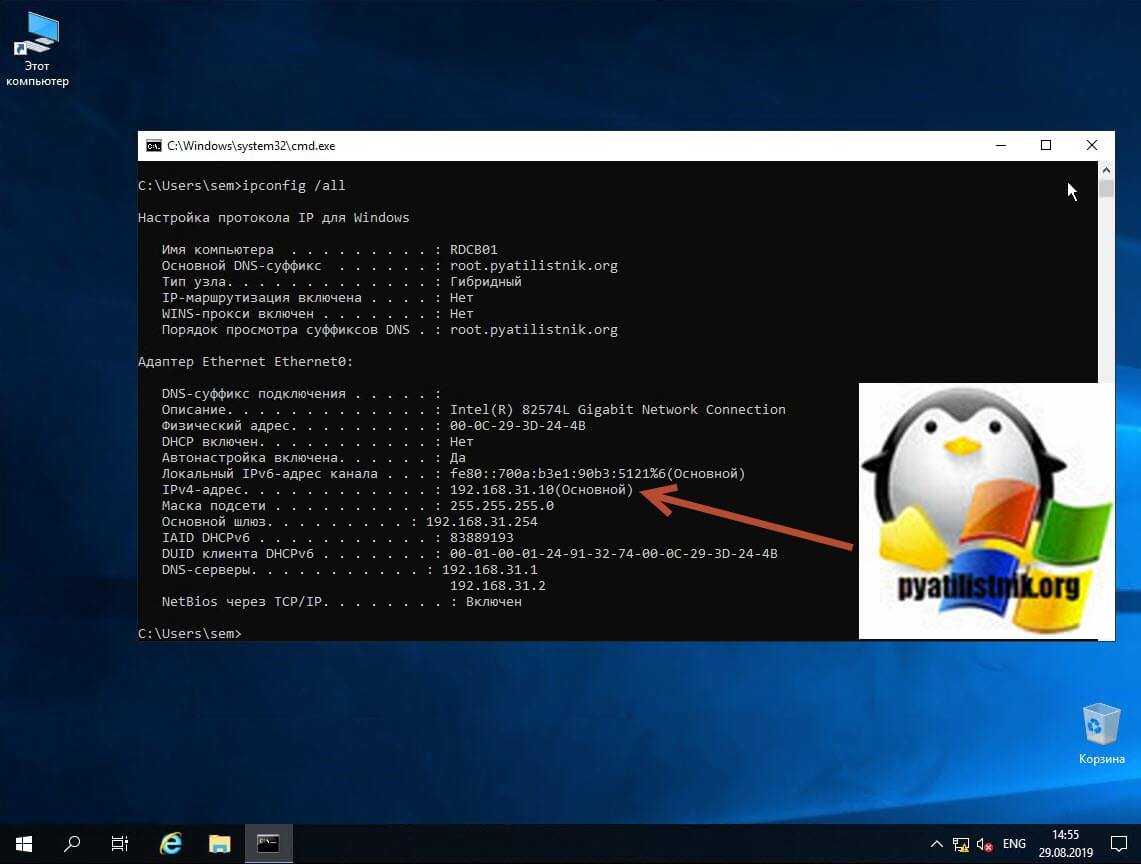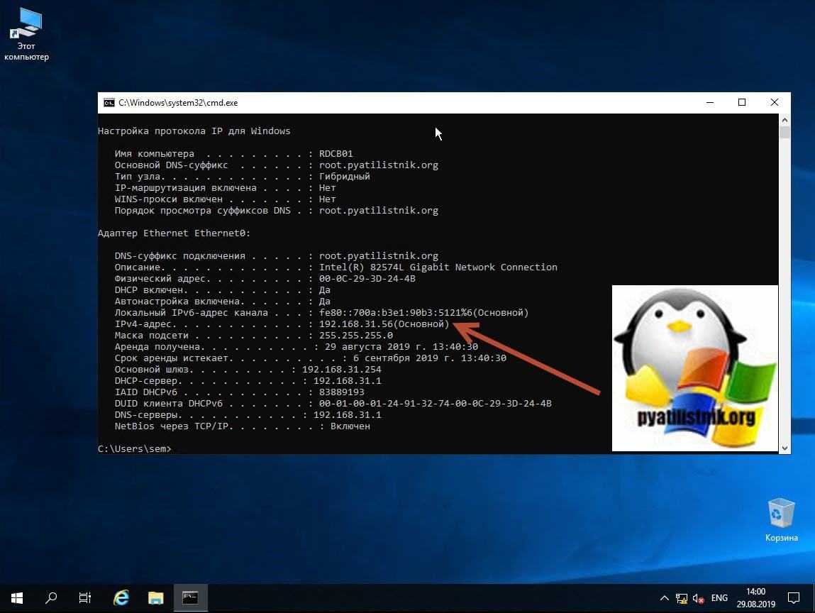 Сохраняем все настройки и проверяем через Ipconfig /all, что все видится. Так же можете попробовать пропинговать ваш основной шлюз или DNS-сервер. На этом графическая настройка сети в Windows Server 2019 окончена.