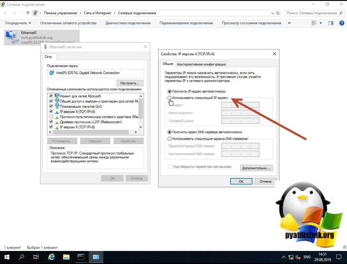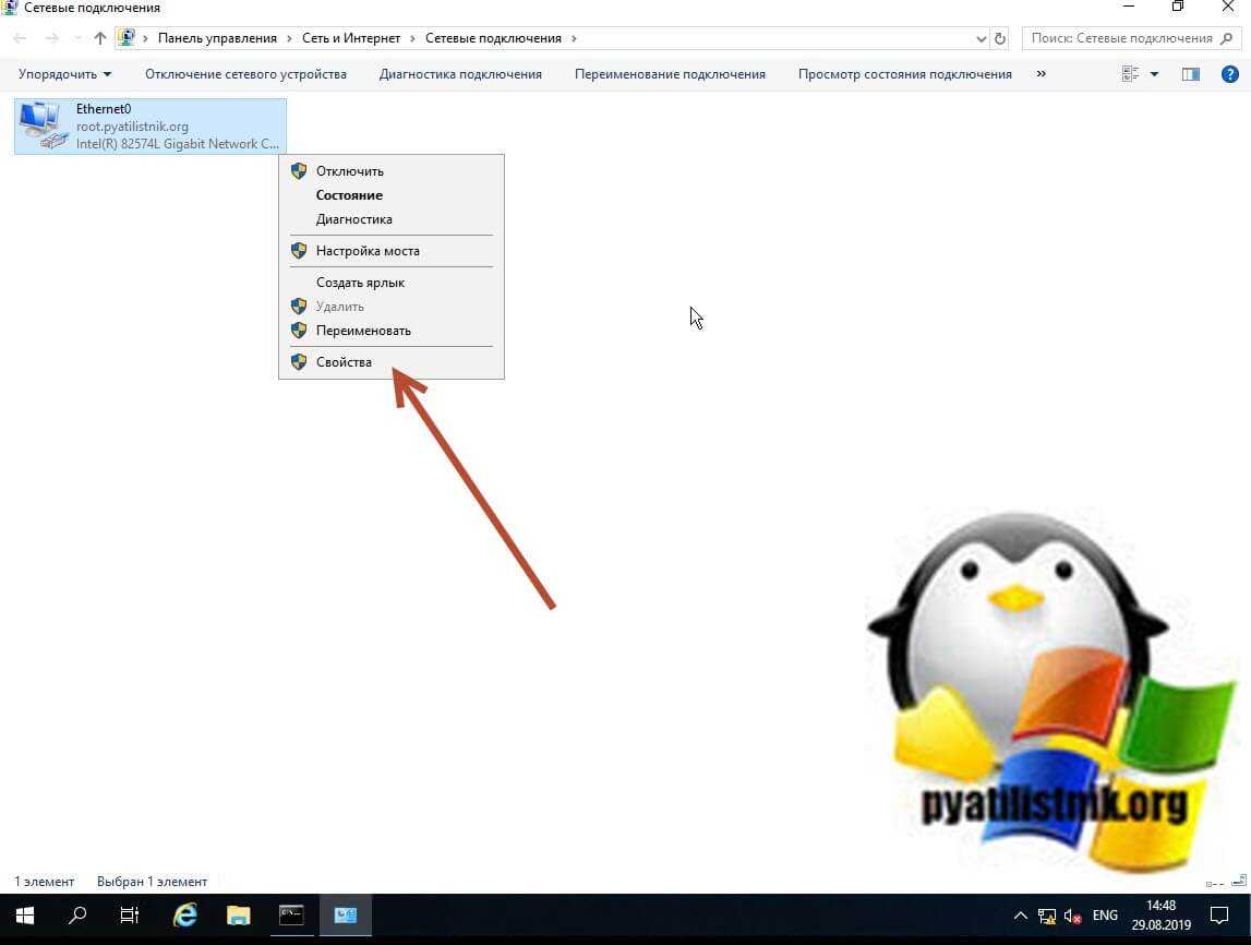 Находим нужный сетевой интерфейс, в моем примере, это единственный Ethernet0 и заходим в его свойства.
