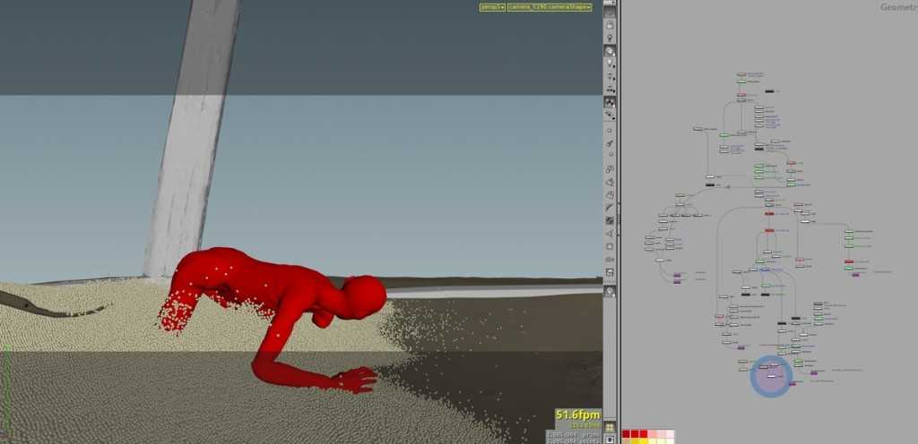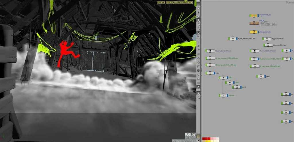 Визуальные эффекты в трейлере, включая невидимую вампиршу, покрытую мерцающей серебряной пылью – сложнейшая задача. Основная работа была выполнена в Houdini, а мерцающие частички добавлены в Yeti. Также в Houdini сделано огромное количество мелких эффектов: пыль, мусор, кровь, искры, летающие листья, дыхание, дым, атмосферики и даже при создании сцены, где вампир ползет по куче кукурузных зерен использовался инструмент зерна Houdini.