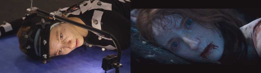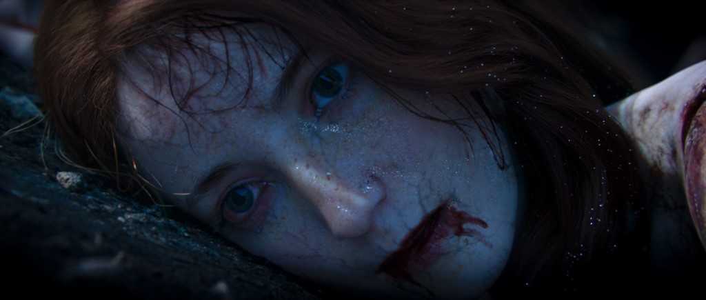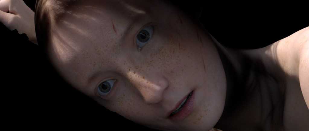 Отдельные раны и кровь были нарисованы и наложены поверх 3D-рендера в NUKE. Текстурные детали и кровь около рта были нарисованы по кадру, отрендеренному из проекционной камеры. Затем это было спроецировано из той же камеры в тот же кадр, на 3D-анимированную Alembic-геометрию ее головы, используя UV. И когда девушка закрывает рот, спроецированная текстура следует за перемещением/изменением геометрии.