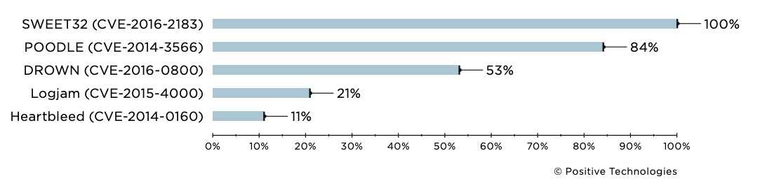 В 53% организаций обнаружены узлы, уязвимые для атаки DROWN. Атака возможна из-за уязвимости CVE-2016-0800 в реализации протокола SSL версии 2. В результате атаки при определенных условиях злоумышленник может завладеть сеансовыми ключами, которые передаются в SSL-сессиях, а значит — получить доступ ко всей информации, передаваемой по зашифрованному каналу.
